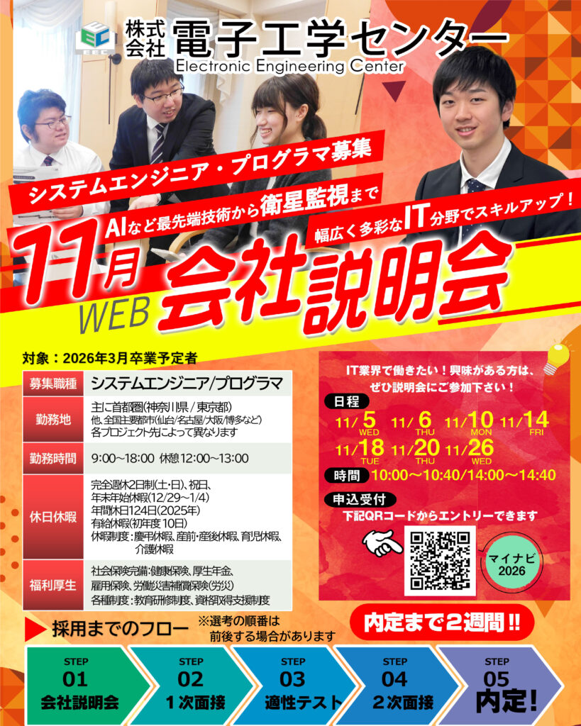 株式会社電子工学センターでは、以下の要領で「2026年新卒採用 Web会社説明会」を開催いたします。